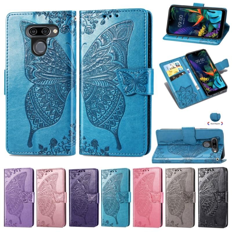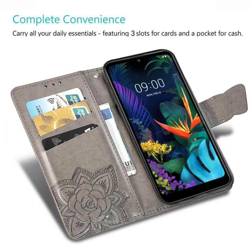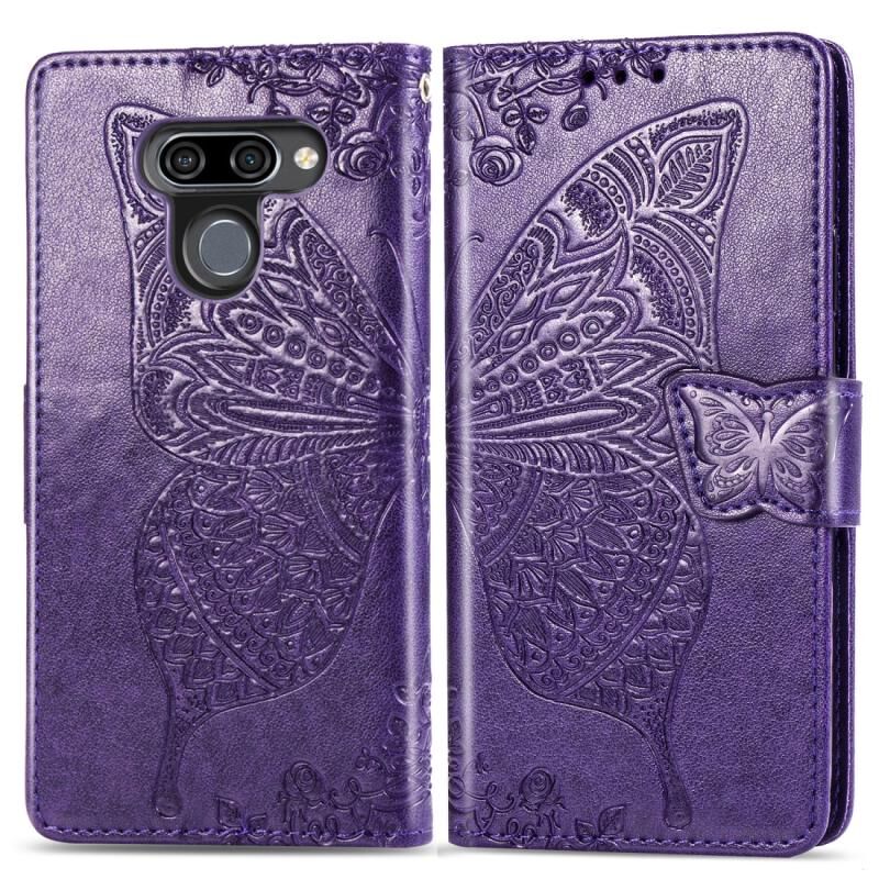 Πεταλούδα αγάπη λουλούδια ανάγλυφη οριζόντια Flip δερμάτινη θήκη για LG K50, με κάτοχο & υποδοχές για κάρτες & πορτοφόλι & κορδόνι (Drak μοβ)
