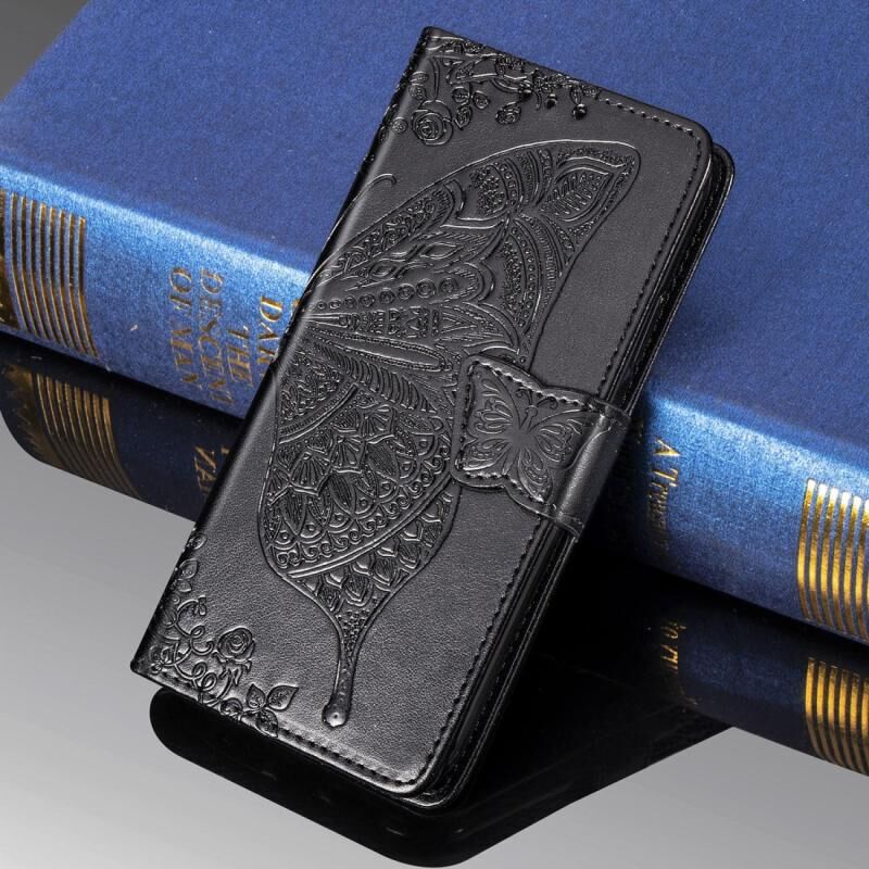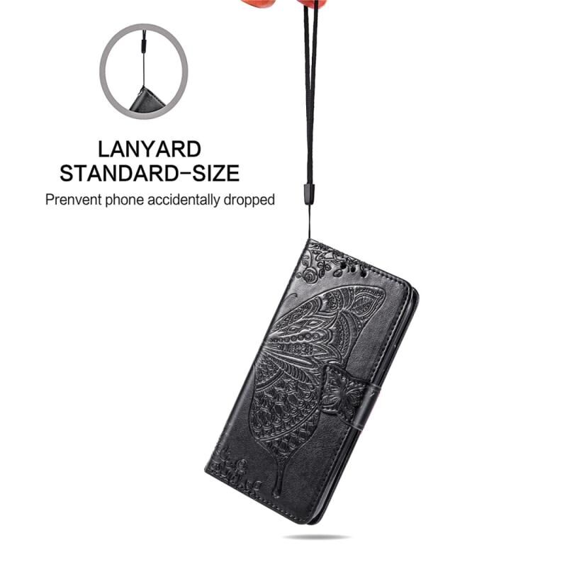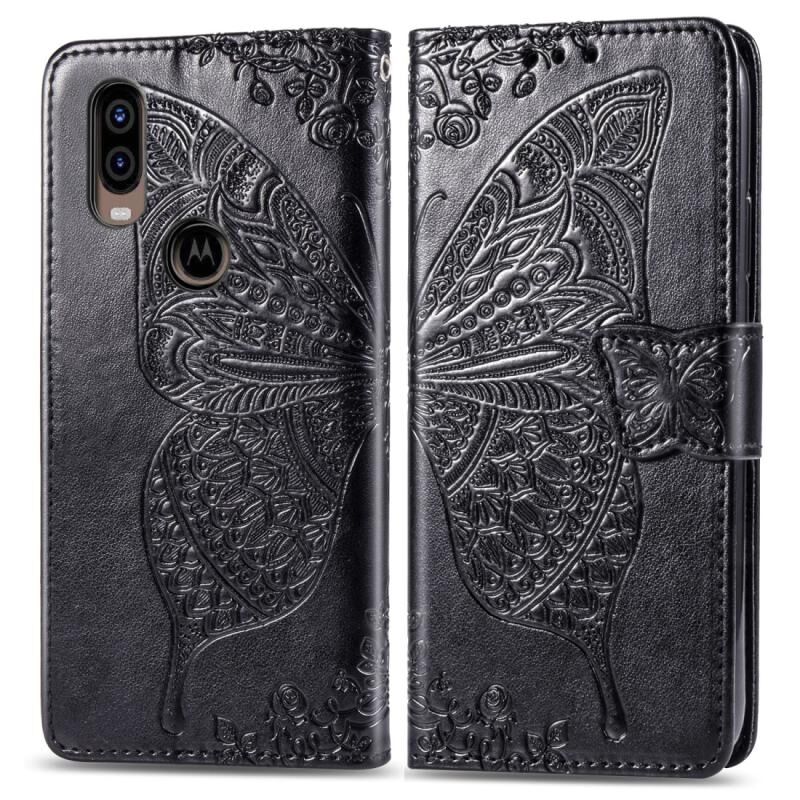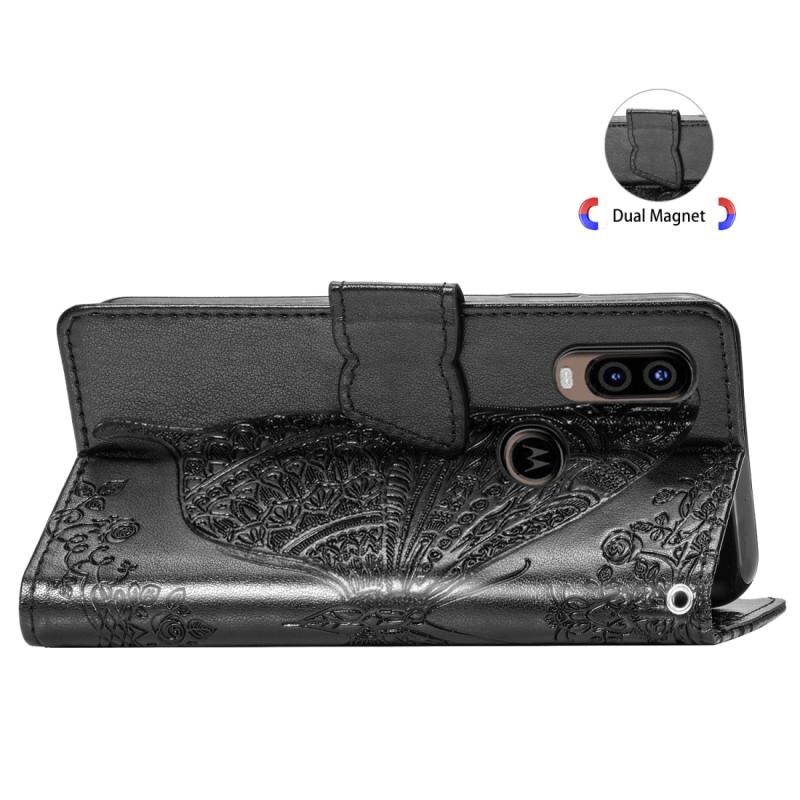 Θήκη δέρματος με οριζόντιο άνοιγμα για Motorola P40 με σχέδιο πεταλούδας, λουλούδια, ανάγλυφο, θήκη, υποδοχές καρτών, πορτοφόλι και λουρί (Μαύρο)