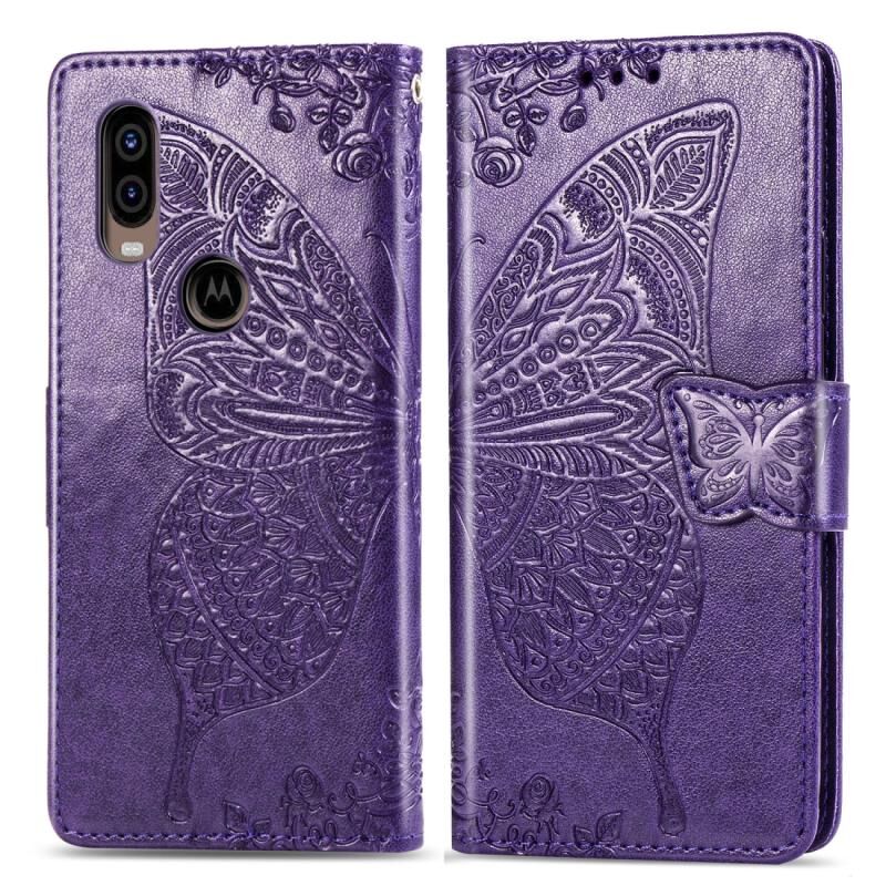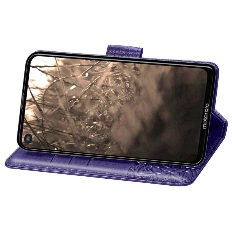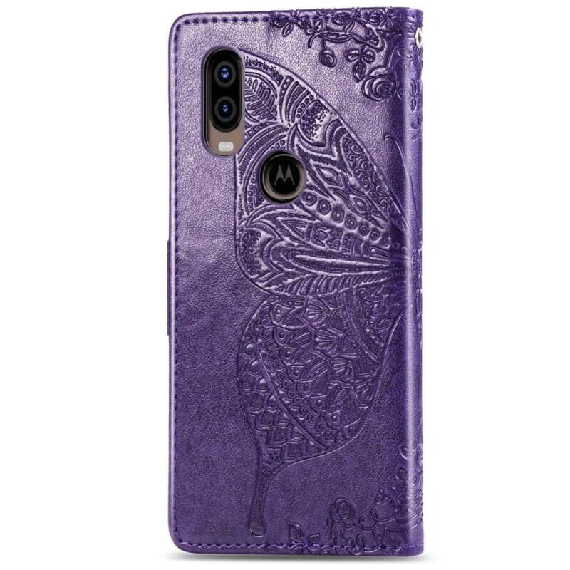 Θήκη δέρματος με οριζόντιο άνοιγμα για Motorola P40 με σχέδιο πεταλούδας, λουλουδιών και ανάγλυφο, με βάση, θήκες για κάρτες, πορτοφόλι και λουρί (σκούρο μωβ)