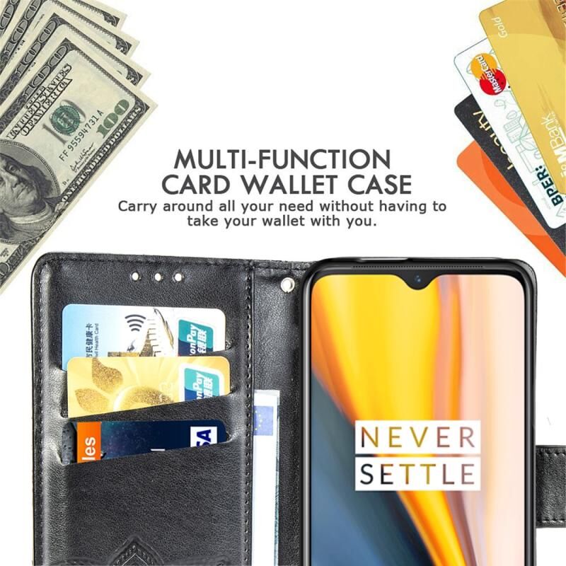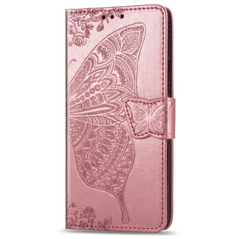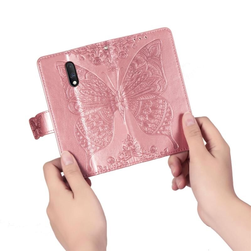 Θήκη δέρματος οριζόντιας αναδίπλωσης για One Plus 7 με σχέδιο πεταλούδας, λουλουδιών και ανάγλυφο, με βάση στήριξης, θήκες για κάρτες, πορτοφόλι και κορδόνι (Χρυσό ροζ)