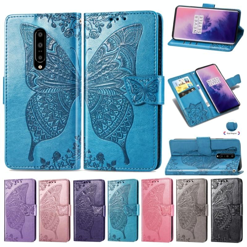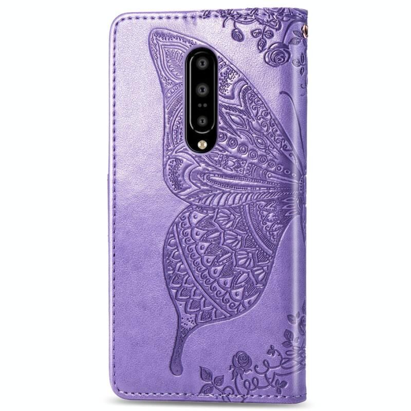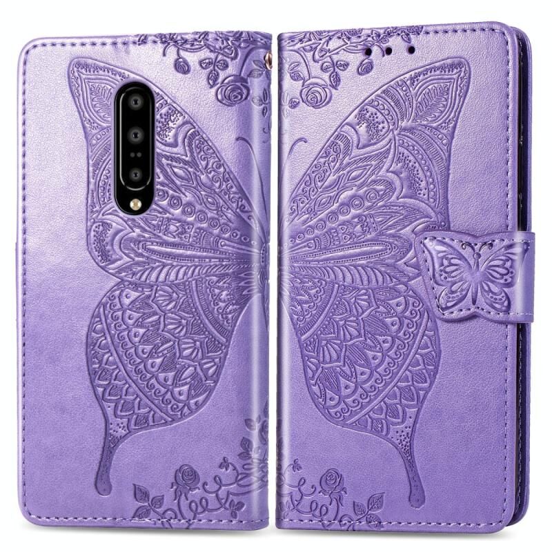 Πεταλούδα αγάπη λουλούδια ανάγλυφη οριζόντια Flip δερμάτινη θήκη για OnePlus 7 Pro, με κάτοχο & υποδοχές για κάρτες & πορτοφόλι & κορδόνι (ανοιχτό μοβ)