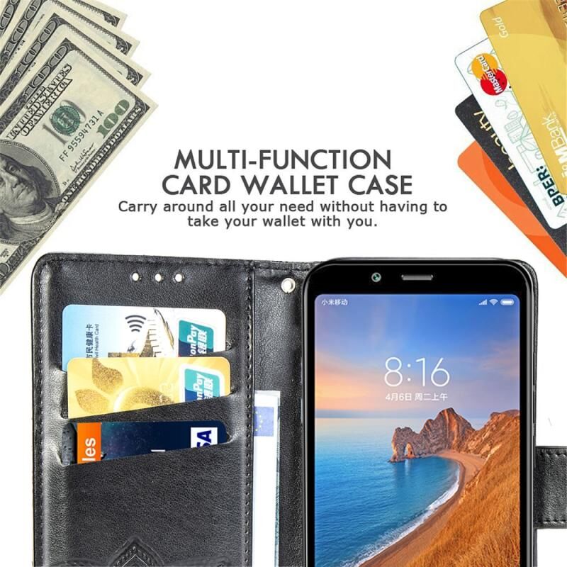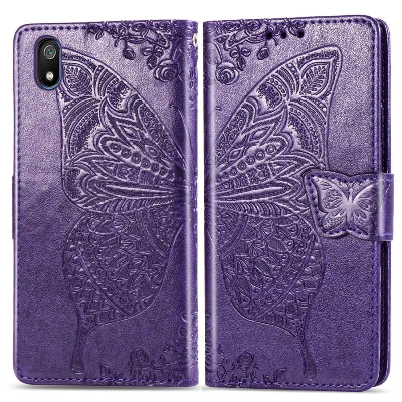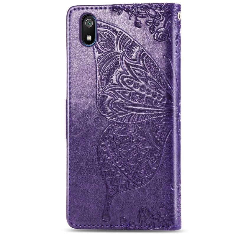 Θήκη δέρματος οριζόντιας αναδίπλωσης για Xiaomi Redmi 7A με σχέδιο πεταλούδας, λουλουδιών και ανάγλυφο, με βάση στήριξης, θήκες για κάρτες, πορτοφόλι και κορδόνι (Σκούρο μωβ)