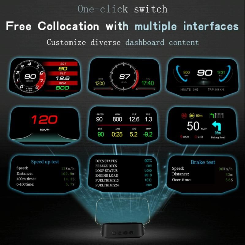 1. OBD mode display information: vehicle speed, rotation speed, water temperature, voltage, mileage, driving time, fuel consumption, local time, oil temperature, driving direction, number of satellites, turbo pressure, air-fuel ratio, intake pressure, acceleration test, brake Test, 100 kilometers acceleration test, read the whole vehicle data stream