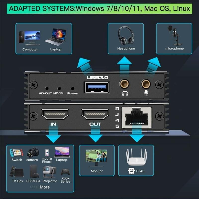 1.Κάρτα Καταγραφής Βίντεο HDMI USB 3.0 4K:Υποστηρίζει HDMI pass-through 4K@60Hz και καταγράφει έως 1080P@60FPS, 2560x1440@50FPS, ή 3840x2160@18FPS μέσω εξόδου USB 3.0.