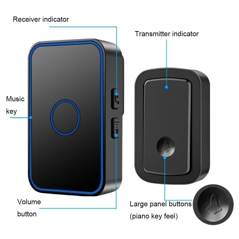 8. Working principle: The transmitter is installed outside the door, the receiver is installed on the power socket, press the transmitter to ring the bell, the receiver immediately rings and flashes to remind