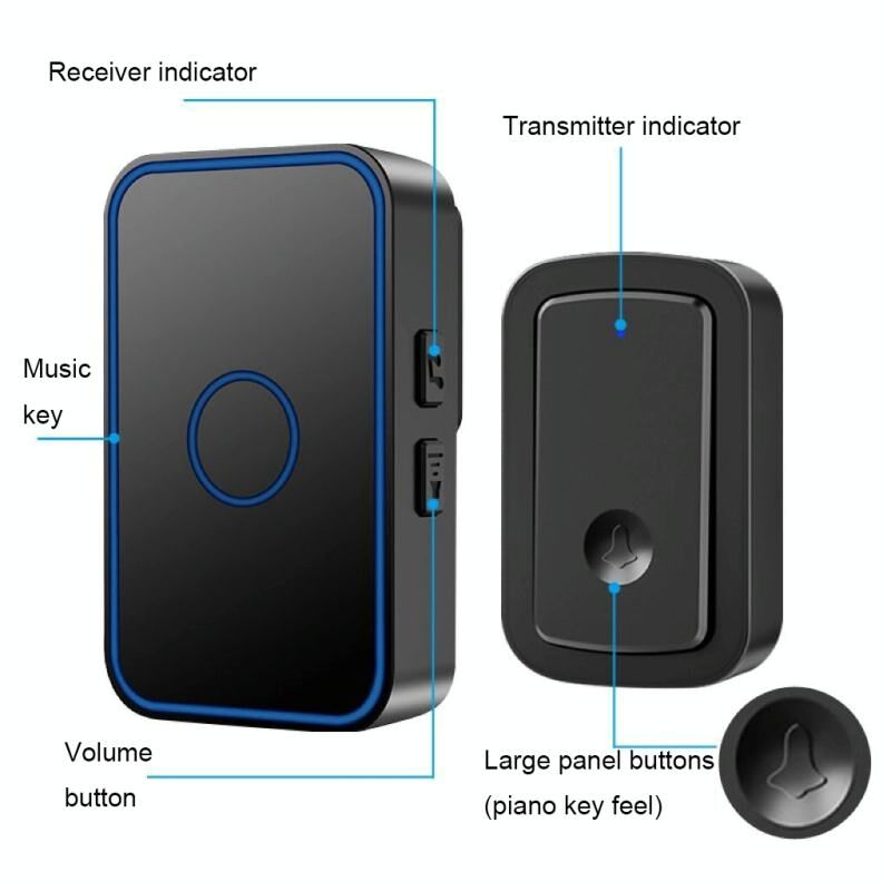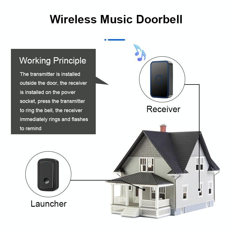 8. Αρχή λειτουργίας: Ο πομπός εγκαθίσταται έξω από την πόρτα, ο δέκτης εγκαθίσταται στην πρίζα, πατήστε τον πομπό για να χτυπήσει η κουδούνια, ο δέκτης χτυπά αμέσως και αναβοσβήνει για να σας υπενθυμίσει
