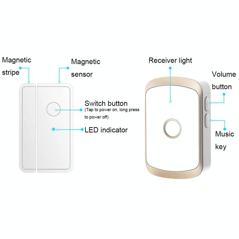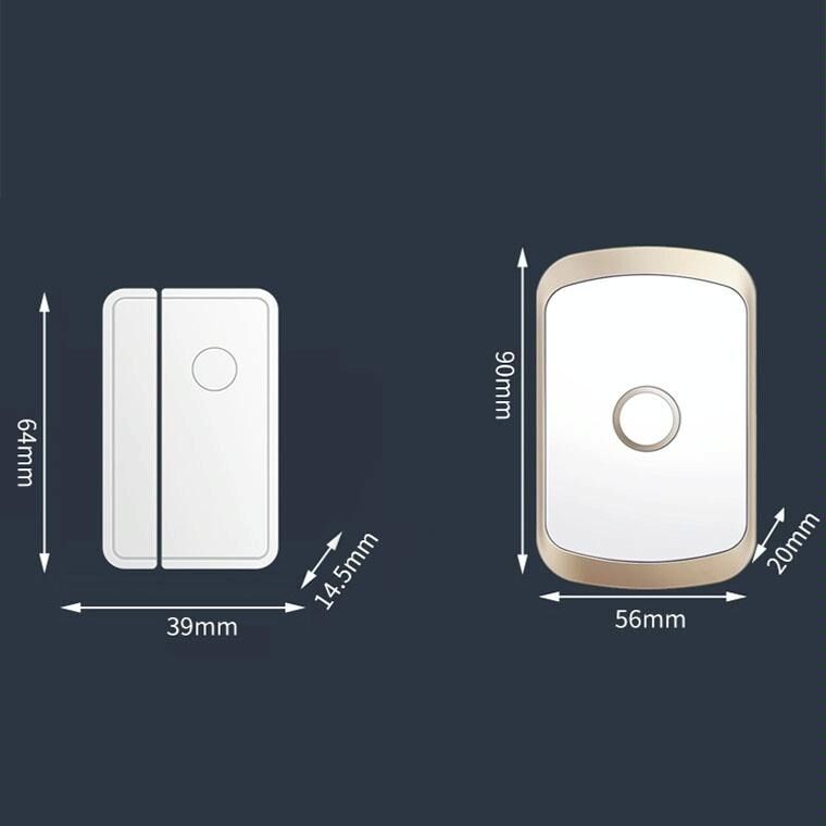 1. Υλικό: ABS, ηλεκτρονικά εξαρτήματα 2. Χαρακτηριστικά: μεγάλη απόσταση μετάδοσης, ενσωματωμένοι 52 ήχοι κλήσης, ρύθμιση έντασης 5 επιπέδων, λυχνία LED, ισχυρή ικανότητα διείσδυσης 3. Εύρος εφαρμογής: 300 μέτρα 4. Μουσική: 52 κομμάτια μουσικής 5. Ένταση: 5 επίπεδα έντασης 6. Τρόπος τροφοδοσίας: τροφοδοσία ρεύματος 7. Μπαταρία δέκτη: συνδέεται απευθείας στην πρίζα 8. Μπαταρία πομπού: 1 x μπαταρία 12V 23A (παραδίδεται χωρίς μπαταρία) 9. Μέθοδος εγκατάστασης: στερέωση με διπλή όψη ταινίας / στερέωση με βίδες 10. Βαθμός στεγανοποίησης: IP44 11. Ο δέκτης διαθέτει λυχνία ένδειξης και η λυχνία κουδουνιού είναι αναμμένη 12. Ισχυρή ικανότητα διείσδυσης για να καλύψει τις οικιακές ανάγκες 13. Η λειτουργία AB πόρτας μπορεί να ρυθμιστεί για να διακρίνει τα σήματα από διαφορετικούς αισθητήρες και να ορίσει διαφορετικούς ήχους 14. Ο αδιάβροχος σχεδιασμός του πομπού μπορεί να αποτρέψει την εισχώρηση βρόχινου νερού, ασφαλής και ανθεκτικός 15. Διαστάσεις προϊόντος: Πομπός: 9 x 5.6 x 2 cm, Δέκτης: 6.4 x 3.9 x 1.45 cm