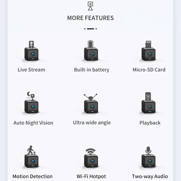 1. Mini Compact security camera, support two way audio, pet camera, baby monitor and siren alarm motion detection, which can be mount anywhere.