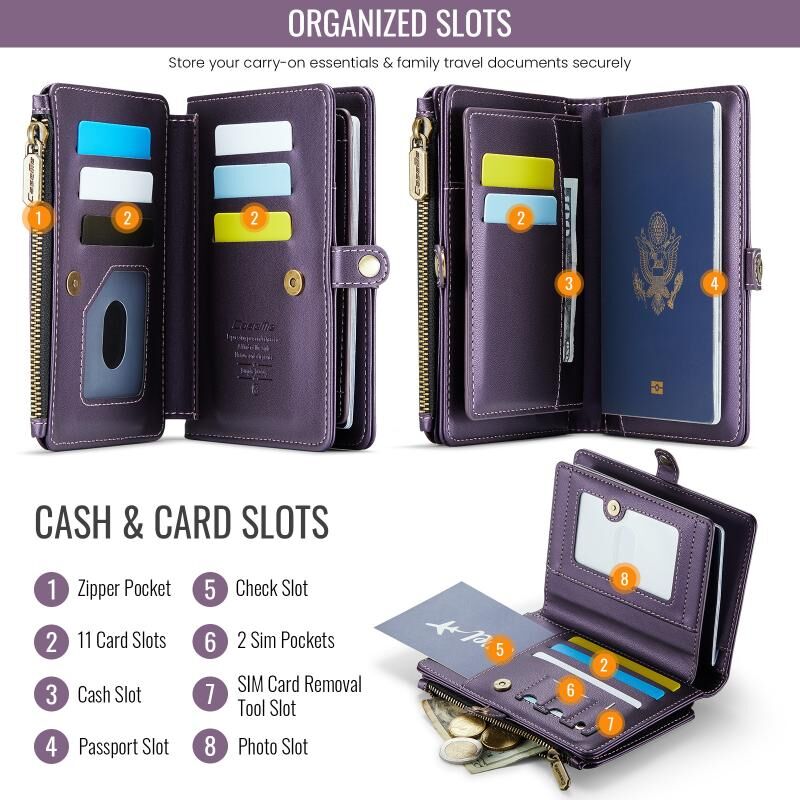 4. 1 passport slot + 1 ticket slot + 11 card slots + 1 money clip + 1 zipper clip + 1 photo slot + 2 SIM card slots + 1 SIM card removal pin position