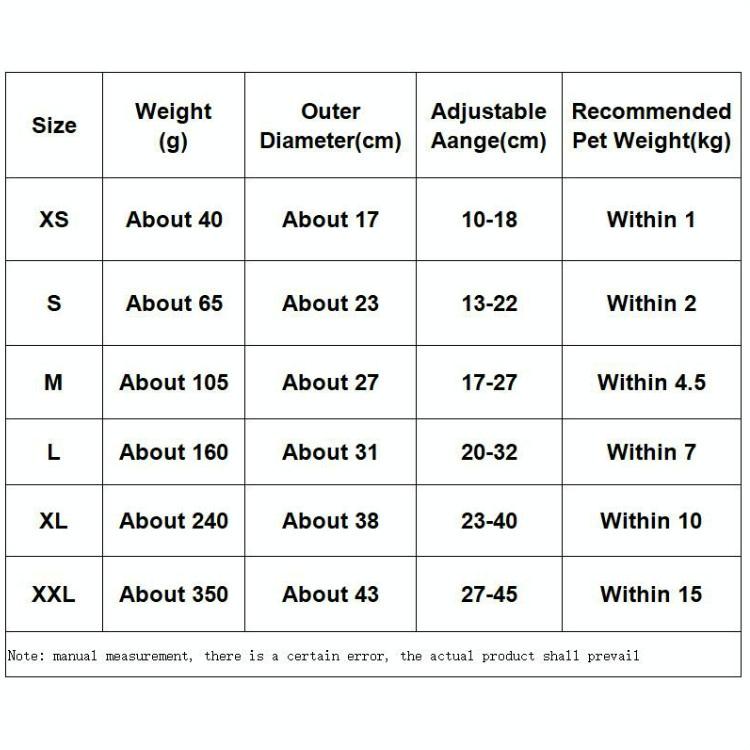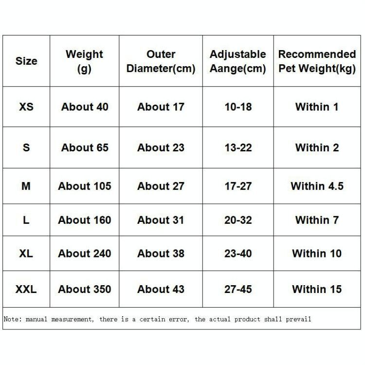 2. Outer diameter: XS is about 17 cm, S is about 23 cm, M is about 27 cm, L is about 31 cm, XL is about 38 cm, and XXL is about 43 cm