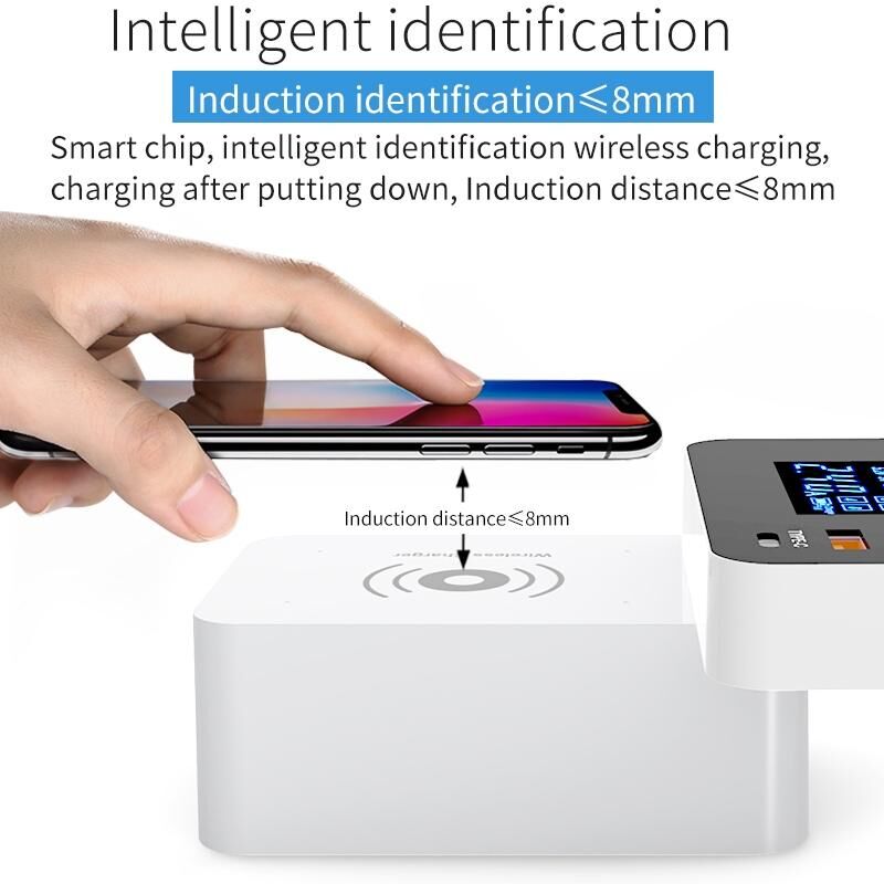 3. Ενσωματωμένο έξυπνο τσιπ, αναγνωρίζει έξυπνα το κινητό τηλέφωνο με ασύρματη φόρτιση, απλώς τοποθετήστε το και φορτίστε, η απόσταση αισθητήρα φόρτισης είναι μικρότερη ή ίση με 8mm και μπορεί επίσης να φορτιστεί η θήκη του κινητού τηλεφώνου.