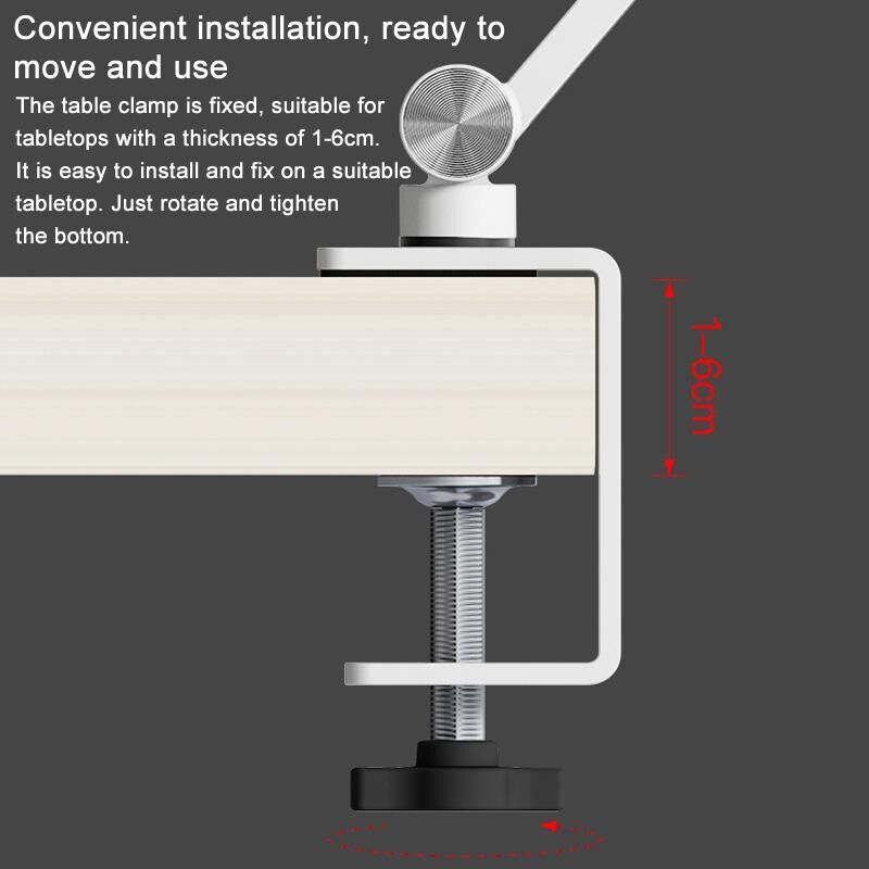 8. Desk clip fixed, suitable for 1-6cm thickness desktop, easy to install, fixed on the appropriate desktop, the bottom of the rotating tighten can be