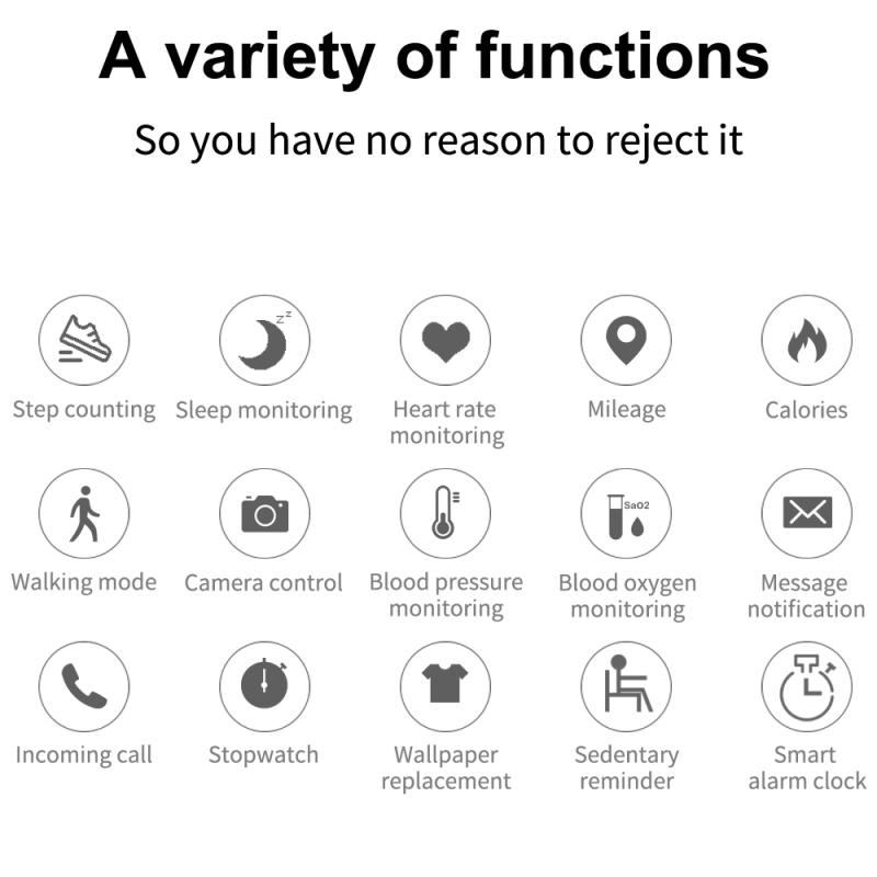 3. Heart rate and blood pressure monitoring, information display, sleep monitoring, multi-sport mode, sedentary reminder, anti-lost reminder, alarm clock reminder, remote camera, screen brightness adjustment, weather reminder