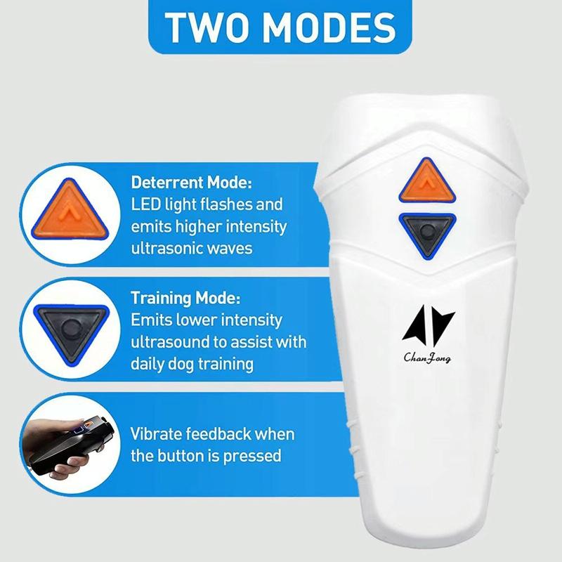 5. Δύο λειτουργίες: λειτουργία αποτροπής: τα φώτα LED αναβοσβήνουν και εκπέμπουν υπερήχους υψηλής έντασης· λειτουργία φιλτραρίσματος: εκπέμπουν υπερήχους χαμηλότερης έντασης για να βοηθήσουν στην καθημερινή εκπαίδευση των σκύλων