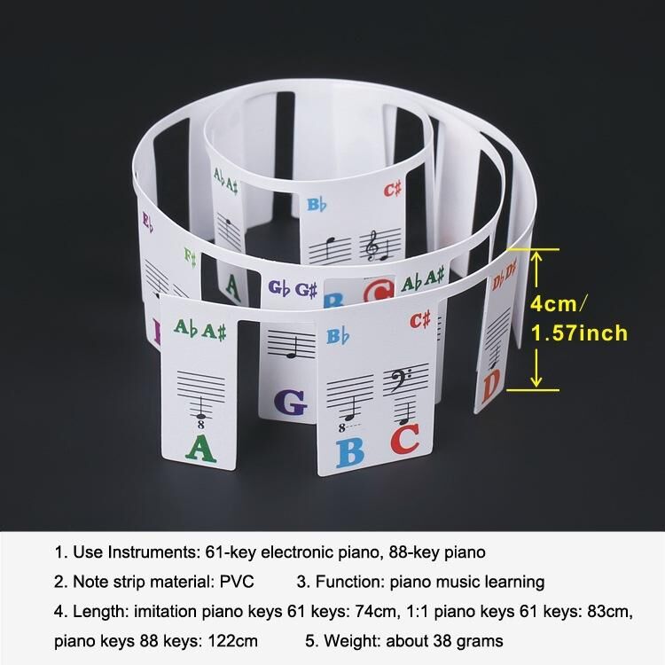 1. Αυτοκόλλητα πληκτρολογίου πιάνου, από επικόλληση, από την εγκατάσταση 2. Γρήγορη εκμάθηση πληκτρολογίου πιάνου, το βασικό βοηθητικό εργαλείο πιάνου 3. Κωδικοποιημένα με χρώματα για να βοηθήσουν στην ευκολότερη αναγνώριση και απομνημόνευση, μεγαλύτερα γράμματα είναι ευκολότερα στην αναγνώριση 4. Εφαρμόζεται σε παιδιά και αρχάριους 5. Εύκολη εγκατάσταση, αναζητήστε το πλήκτρο μεσαίου C που είναι σημειωμένο στην ετικέτα πλήκτρου πιάνου για να ταιριάξετε, πατήστε το ίδιο πλήκτρο στο πιάνο, στη συνέχεια ισιώστε και στοιβάζετε τις νότες στο πληκτρολόγιο. 6. Το αυτοκόλλητο πληκτρολογίου πιάνου είναι ένα καλό διδακτικό εργαλείο, εύκολο στη μεταφορά 7. Χωρίς επικόλληση, χωρίς ζημιά στα πλήκτρα 8. Υλικό PVC, αντοχή στο σκίσιμο και ανθεκτικότητα 9. Μπορεί να καθαριστεί με νερό και είναι plug-and-play χωρίς επικόλληση 10. Απλώς τοποθετήστε το απαλά, μπορείτε εύκολα να τοποθετήσετε αυτοκόλλητα πιάνου 11. Όργανα χρήσης: ηλεκτρονικό πιάνο 61 πλήκτρων, πιάνο 88 πλήκτρων 12. Υλικό λωρίδας νότας: PVC 13. Λειτουργία: εκμάθηση μουσικής πιάνου 14. Μήκος: απομίμηση πλήκτρων πιάνου 61 πλήκτρα: 74cm, πλήκτρα πιάνου 61 πλήκτρα: 83cm, πλήκτρα πιάνου 88 πλήκτρα: 122cm 15. Βάρος: περίπου 38 γραμμάρια