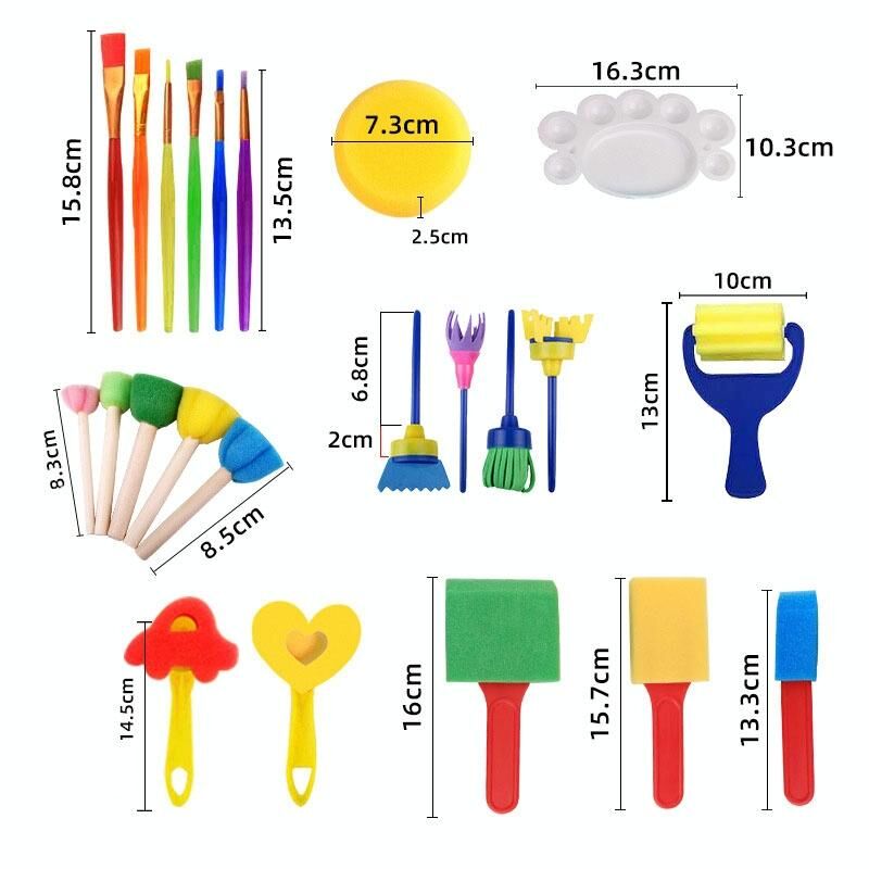 5. Μέγεθος: ρούχα ζωγραφικής 39.5x50cm, μανίκια 14x21cm, μικρή σκούπα μήκος 8.8cm, κίτρινη λαβή μήκος 14.5cm, πινέλο μήκος 13.5-15.8cm, διάμετρος στρογγυλού σφουγγαριού 7.3cm, παλέτα 10.3x16.3cm, πολύχρωμη κεφαλή μανιταριού μήκος περίπου 8.5cm, μεγάλη σφεντόνα 10x13cm, και μήκος πινέλου ταινίας 13.3/15.7/16cm