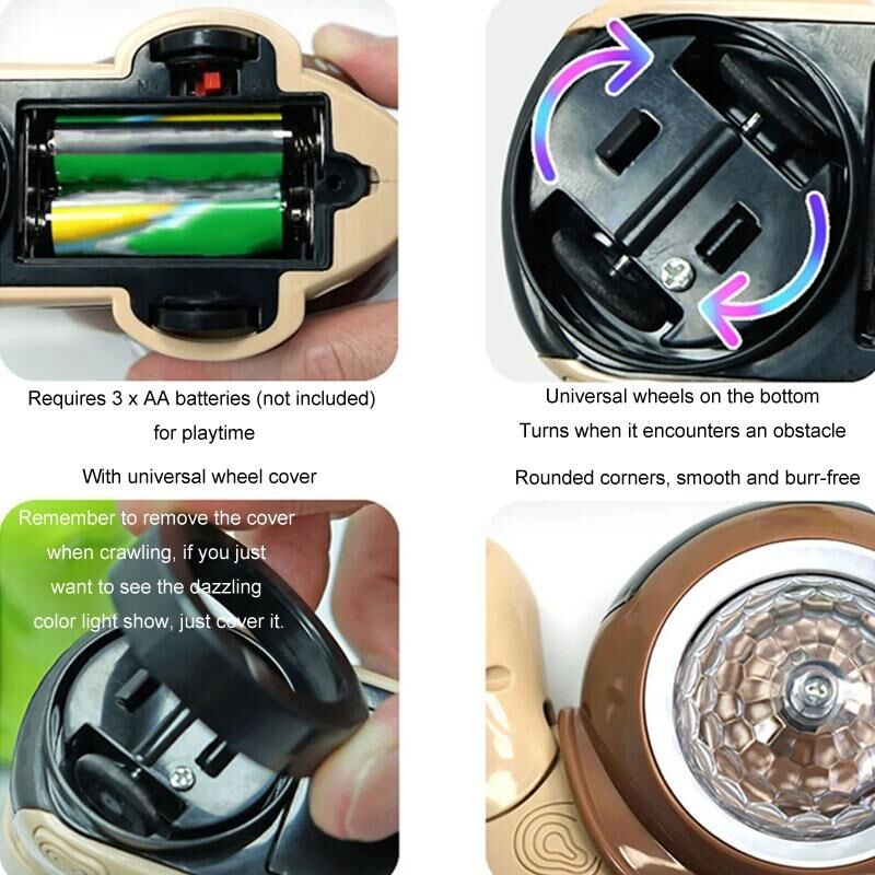 1. Υλικό: πλαστικό 2. Λειτουργία τηλεχειριστηρίου: αισθητήρων κίνησης 3. Τροφοδοσία: 3 x μπαταρίες AA (δεν περιλαμβάνονται) 4. Κατάλληλη ηλικία: παιδιά (4-6 ετών) 5. Ειδική λειτουργία: καθολική κίνηση, προβολή φωτός, μουσική 6. Βάρος: περίπου 230 γρ 7. Μέγεθος: περίπου 11 x 13,5 x 9 εκ Χαρακτηριστικά: 1. Είναι κατασκευασμένο από υλικό ABS, το οποίο είναι ασφαλές, ανθεκτικό, ισχυρό και μακράς διαρκείας 2. Ρεαλιστικό και χαριτωμένο σχέδιο καρτούν σαλιγκαριού, εύκολο να τραβήξει την προσοχή των παιδιών 3. Αποσπώμενα μαλακά μάτια σιλικόνης, μπορούν να κρατηθούν, το σαλιγκάρι θα τρέχει επίσης ενώ κουνιέται, δημιουργώντας πολλή διασκέδαση 4. Καλός βοηθός για το μωρό να μάθει να σέρνεται, καθοδηγεί το μωρό να εξασκήσει το σέρνεται, το περπάτημα, να ασκήσει τον συντονισμό των άκρων, να κυνηγήσει και να παίξει για διασκέδαση 5. Καθολική κίνηση, όταν συναντά εμπόδια θα στρίβει αυτόματα, περιστρεφόμενη φωτεινή μπάλα, φώτα που αναβοσβήνουν, χαρούμενη μουσική 6. Ευρεία γκάμα χρήσεων, κατάλληλο για παιδιά να παίζουν στο σαλόνι, στο παιδικό δωμάτιο, στο μπαλκόνι ή στον κήπο, κατάλληλο για παιχνίδια και δώρα διακοπών