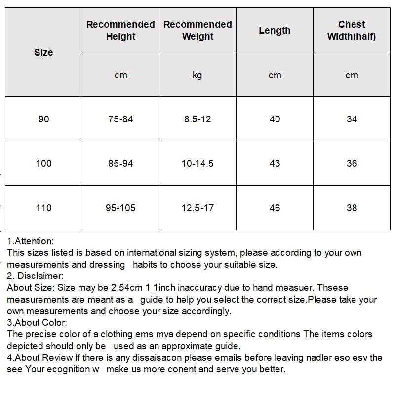 9. Size: 90 (recommended for 0-2 years old); 100 (recommended for 2-3 years old); 110 (recommended for 3-4 years old)