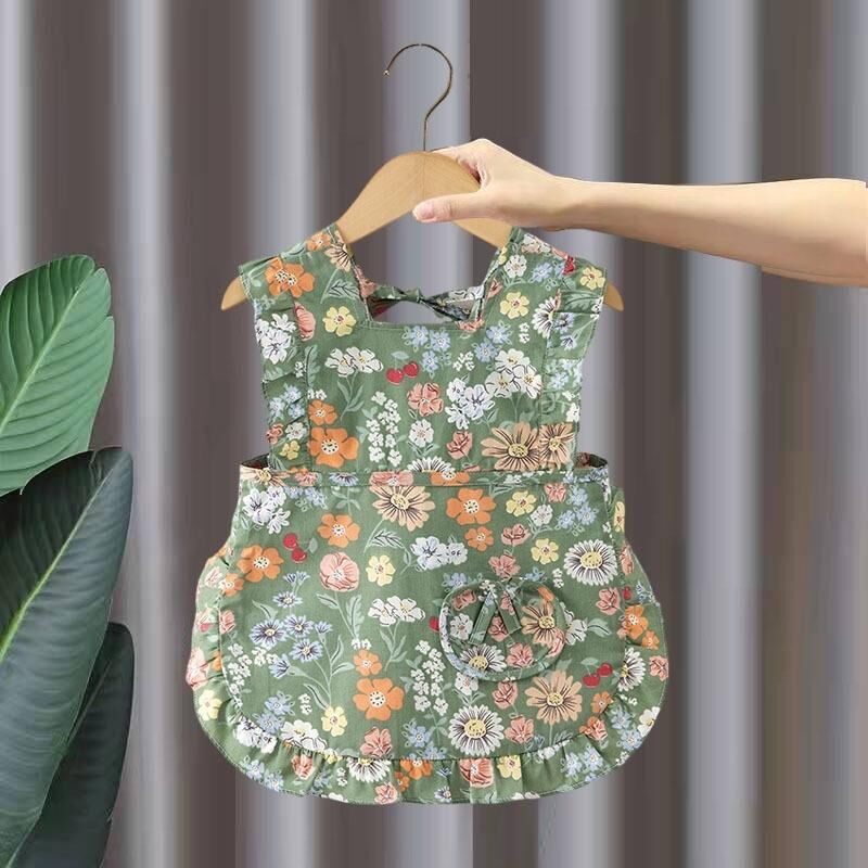 Children Summer Sleeveless Bibs Flowery Eating Reversible Clothes, Style: Green Flower(Size: 90)