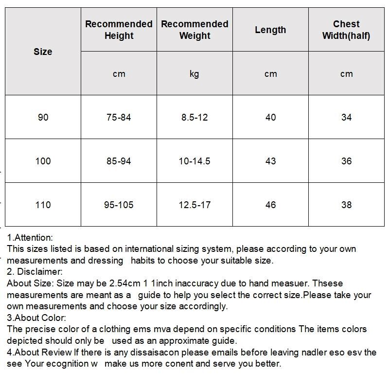 9. Size: 90 (recommended for 0-2 years old); 100 (recommended for 2-3 years old); 110 (recommended for 3-4 years old)