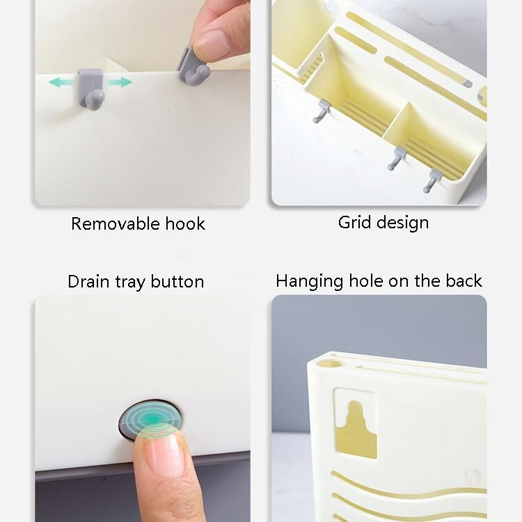 5. Χαρακτηριστικά: όμορφο και πρακτικό, μη σημαδεύουσα επικόλληση, οπές για κρέμασμα στο πίσω μέρος, απλή και βολική εγκατάσταση, χωρίς ζημιά στον τοίχο, αδιάβροχο και ανθεκτικό στην υγρασία, σταθερό και δεν πέφτει εύκολα, καλή φέρουσα ικανότητα, λείες ακμές και χωρίς γρέζια, αποσπώμενα άγκιστρα, σχεδιασμός διαμερίσματος, σύνδεση με ιμάντα Δίσκος νερού για εύκολη αποστράγγιση