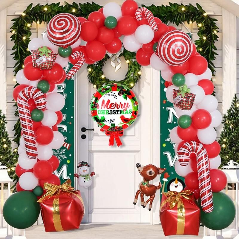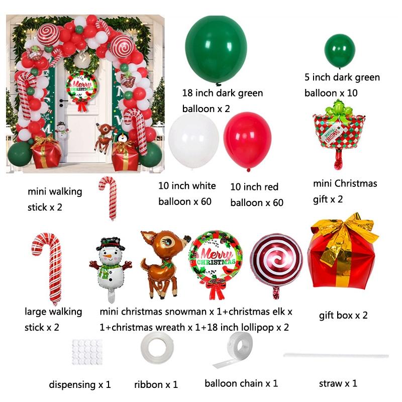 10. Balloon chain 2 specifications: 10 inch red balloon x 60+10 inch white balloon x 60+5 inch dark green balloon x 10+18 inch dark green balloon x 2+mini christmas gift x 2+mini walking stick x 2+large walking stick x 2+mini christmas black hat snowman x 1+18 inch lollipop balloon x 2+18 inch christmas wreath x 1+christmas elk x 1+gift box x 2+balloon chain x 1+ribbon x 1+dispensing x 1+ straw x 1
