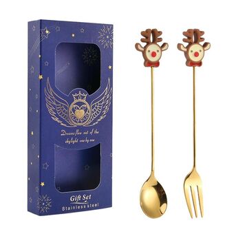 2τμχ /Συσκευασία Χριστουγεννιάτικη Σπάτουλα Δώρου, Χαριτωμένο Πιρούνι Φρούτων, Κουτάλα για Επιδόρπιο/Καφέ, Στυλ: Ελάφι (Μπλε Κουτί)
