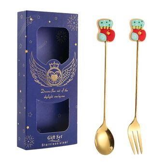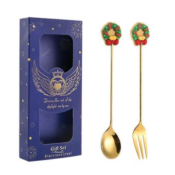 2τμχ /Συσκευασία Κουτάλι Δώρου Χριστουγέννων, Πιρούνι Φρούτων σε Σχέδιο Καρτούν, Κουτάλα για Επιδόρπιο/Καφέ, Στυλ: Στεφάνι (Μπλε Κουτί)