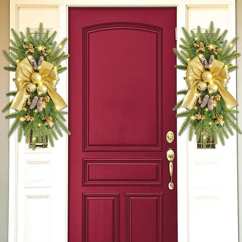 3. Το στεφάνι είναι διακοσμημένο με κόκκινες μπάλες, φυσικούς πευκοκώνους, κόκκινες μούρες, πράσινα φύλλα, αγκινάρες, κλαδιά ελάτης, βελόνες πεύκου κ.λπ.