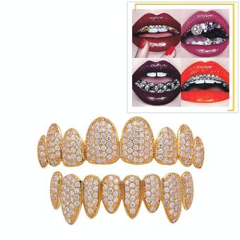 Hip Hop Braces Inlaid With Zircon, Eight Teeth Inlaid With Drill, Upper And Lower Dentures Set COS Props(Gold)