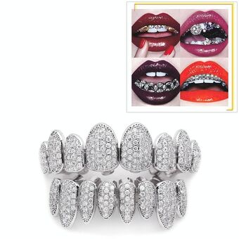 Hip Hop Braces Inlaid With Zircon, Eight Teeth Inlaid With Drill, Upper And Lower Dentures Set COS Props(Silver)
