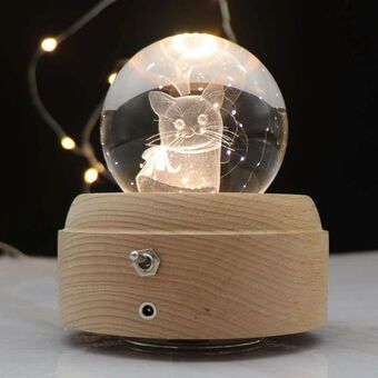 Κορίτσι κομοδίνο λάμπα κρυστάλλινη μπάλα ξύλινη βάση μουσικό κουτί φόρτισης λάμψη περιστρεφόμενο φως νύχτας, τυχαία μουσική (γάτα)
