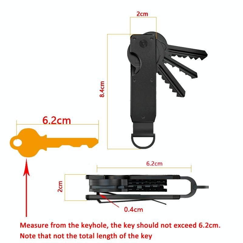 1. Μια συμπαγής θήκη κλειδιών που εξαλείφει το κουδούνισμα των κλειδιών, αποτρέπει την ενόχληση στα μηρούς και προστατεύει το πορτοφόλι, το τηλέφωνο και τα αξεσουάρ σας από γρατζουνιές. 2. Κατασκευασμένο από κράμα αλουμινίου για να εξασφαλιστεί η αντοχή. 3. Βολικός σχεδιασμός με κλιπ, το οποίο μπορείτε εύκολα να το στερεώσετε στη ζώνη ή στα τζιν σας, διατηρώντας τα κλειδιά σας οργανωμένα και πάντα προσβάσιμα όπου κι αν πάτε. 4. Μπορεί να χωρέσει 2-6 κλειδιά για μεγαλύτερη ευκολία. 5. Περιλαμβάνει ένα κατσαβίδι για εύκολη εγκατάσταση των κλειδιών. Μετρήστε από την τρύπα του κλειδιού, το κλειδί δεν πρέπει να υπερβαίνει τα 6,2 cm, σημείωση: μετριέται από την τρύπα του κλειδιού. 6. Βάρος: 36g