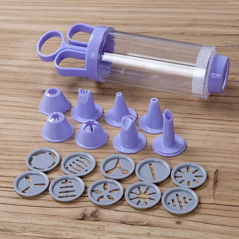 2. Συσκευασία: πιστόλι μπισκότων + 8 στόμια + 10 τεμάχια λουλουδιών