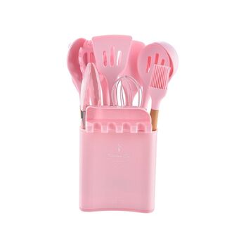 KU349 13 σε 1 Αποθήκευση βαρέλι ξύλινη λαβή σιλικόνης σετ σκευών κουζίνας μη κολλητικά μαγειρέματος Κουτάλι φτυάρι Κουζίνα Rack (ροζ)