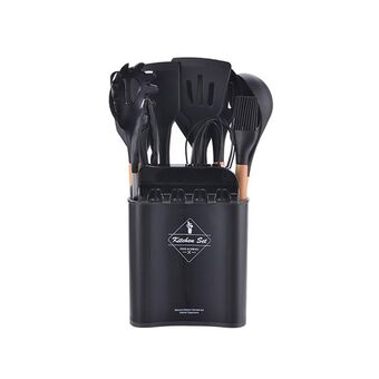 KU349 13 σε 1 Αποθήκευση βαρέλι με ξύλινη λαβή σιλικόνης σετ σκευών κουζίνας μη κολλητικό μαγειρικό κουτάλι φτυάρι ράφι κουζίνας (μαύρο)