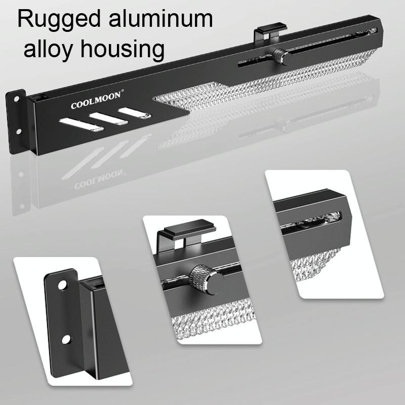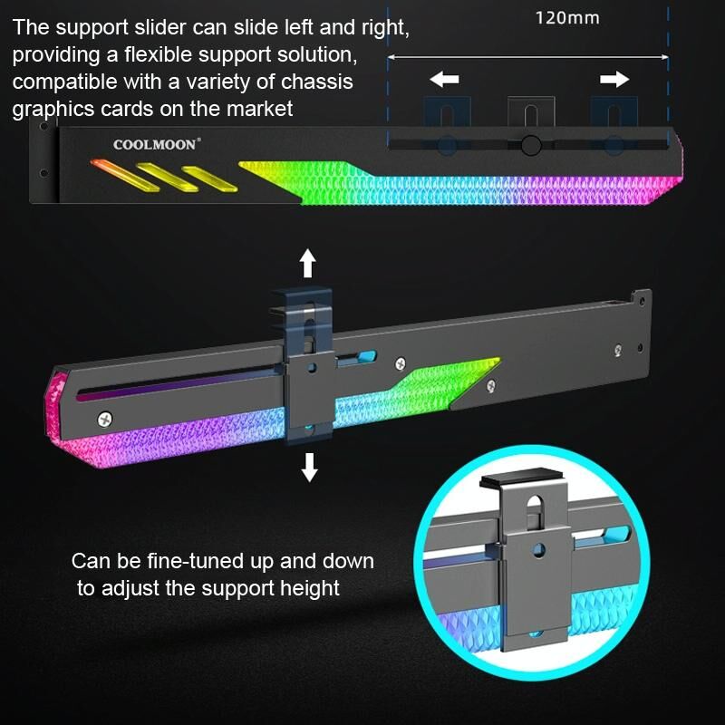 6. Ρυθμιζόμενη ολίσθηση, απλή και βολική. Η ράγα ολίσθησης στήριξης μπορεί να γλιστρήσει αριστερά και δεξιά, παρέχοντας ευέλικτη στήριξη και έλεγχο, συμβατή με μια ποικιλία καρτών γραφικών πλαισίου στην αγορά, για να καλύψει τις διαφορετικές ανάγκες των χρηστών, το μήκος της αυλάκωσης είναι 120mm, η στήλη στήριξης μπορεί να ρυθμιστεί λεπτομερώς πάνω-κάτω και διαφορετικά ύψη στήριξης μπορούν να ρυθμιστούν για κάρτες γραφικών διαφορετικών υψών.
