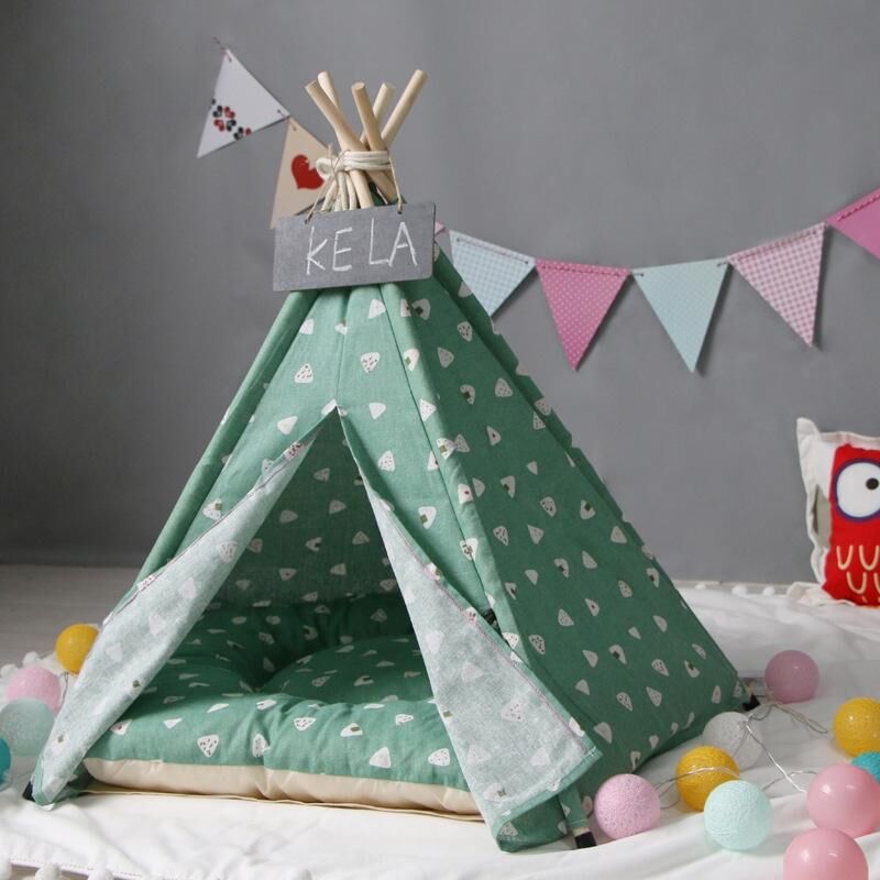 Cotton Canvas Pet Tent Cat and Dog Bed with Cushion, Specification: Medium 50×50×60cm(Green Triangle)