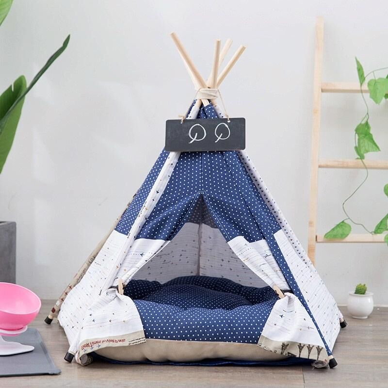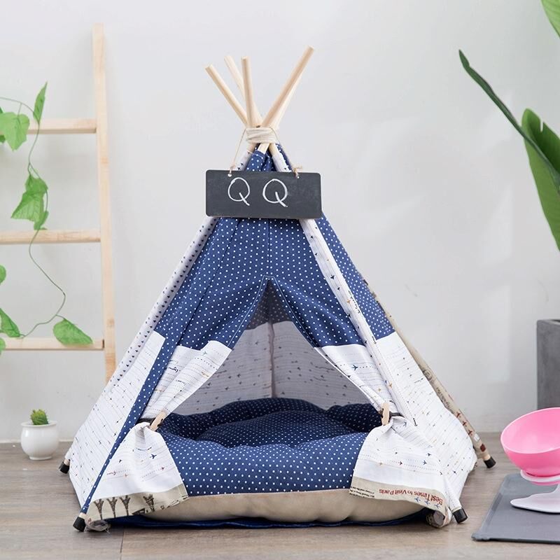 Σκηνή κατοικίδιων από καμβά βαμβακιού, κρεβάτι για γάτες και σκύλους με μαξιλάρι, Προδιαγραφές: Μικρό 40×40×50cm (Λευκές κουκκίδες)