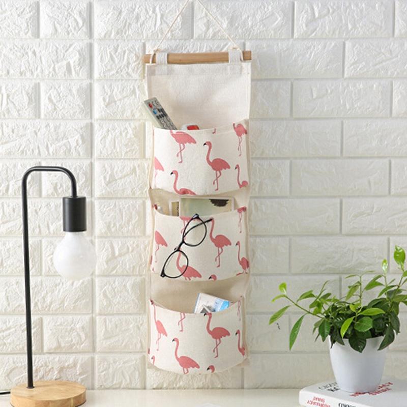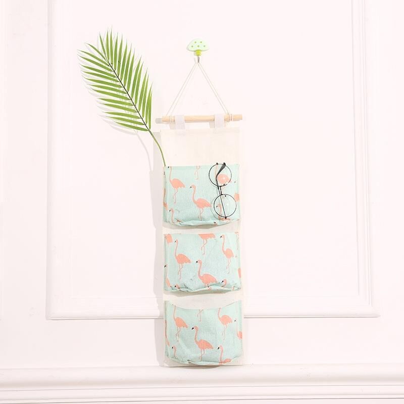 Cotton Linen Hanging Storage Bag 3 Pockets Wall Mounted Wardrobe Hang Bag Wall Pouch Cosmetic Toys Organizer(Green flamingo)