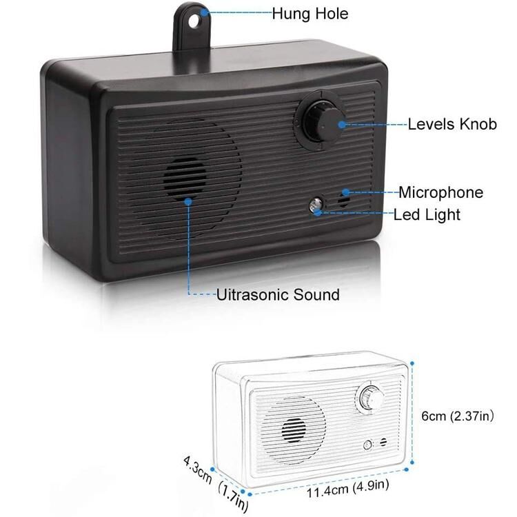 1. Υλικό: πλαστικό 2. Τροφοδοσία: 1 μπαταρία 9V (δεν περιλαμβάνεται) 3. Χρησιμοποιεί υπερήχους για να αποτρέψει τα ενοχλητικά γαβγίσματα σκύλων 4. Μπορεί να ελέγξει τα γαβγίσματα σκύλων εντός 15 μέτρων 5. 3 επίπεδα ρύθμισης ευαισθησίας (15-30KHZ) 6. Διχρωμη ένδειξη χαμηλής μπαταρίας 7. Αδιάβροχο και ανθεκτικό, ασφαλές και αποτελεσματικό 8. Βάρος: περίπου 150g 9. Μέγεθος: περίπου 11.4x6x4.3 cm
