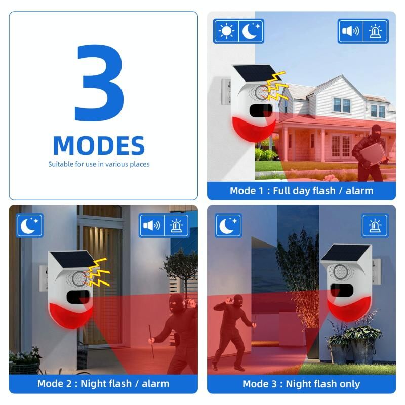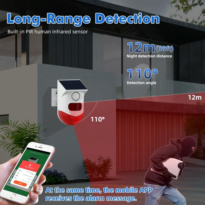 3. The sensing angle of the solar alarm motion detector is 110 degrees, it will detect any motion within a range of 9-12 meters (affected by the environment).
