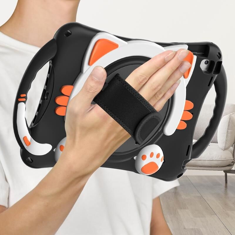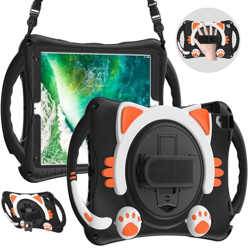 Cute Cat King Kids Shockproof Silicone Tablet Case with Holder & Shoulder Strap & Handle For iPad 9.7 2018 / 2017 / Air / Air 2 / Pro 9.7(Black Orange)