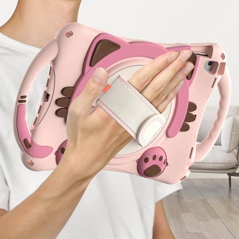 Cute Cat King Kids Shockproof Silicone Tablet Case with Holder & Shoulder Strap & Handle For iPad 9.7 2018 / 2017 / Air / Air 2 / Pro 9.7(Pink)