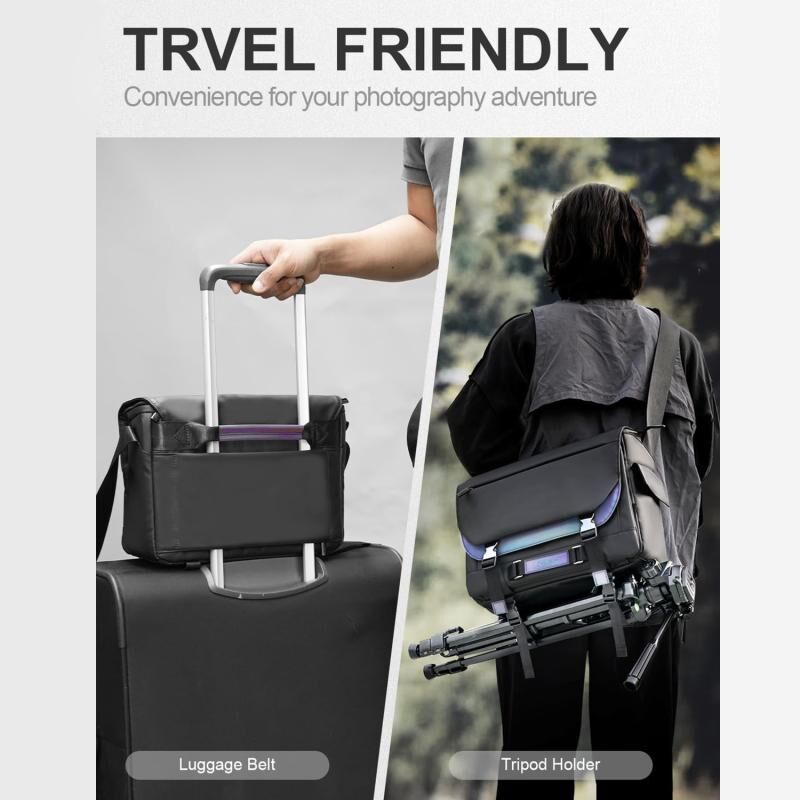2. Side Access & Travel-Friendly Design: Enjoy hassle-free access to your equipment with side quick access, perfect for capturing spontaneous moments. This camera crossbody bag is designed for travel, featuring a tripod holder and luggage belt for added convenience during your photography adventures.
