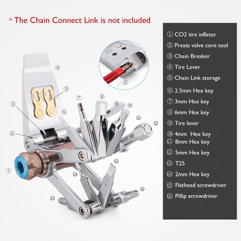 5. 16-in-1 bicycle repair tool: with 2/2.5/3/4/5/6 and 8mm Allen wrench, Torx T25, flat/cross wrench, air nozzle removal tool, inflation tool, connector, 2 prying tools Tire rod, snap-on adsorber