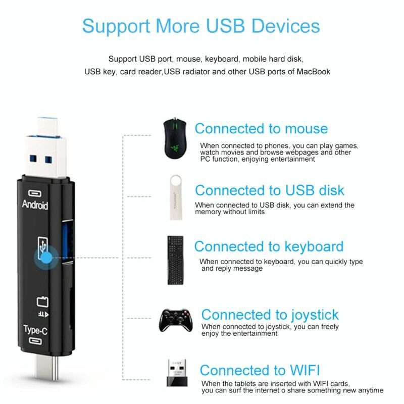 2. 3 in 1 USB 2.0 / Micro USB / TF / OTG Type C Smart Memory Card Adapter for Laptop USB 2.0 Cardreader SD Card Reader,Support USB devices such as USB interface phones ,USB flash disk, USB mouse, USB keyboard and etc.