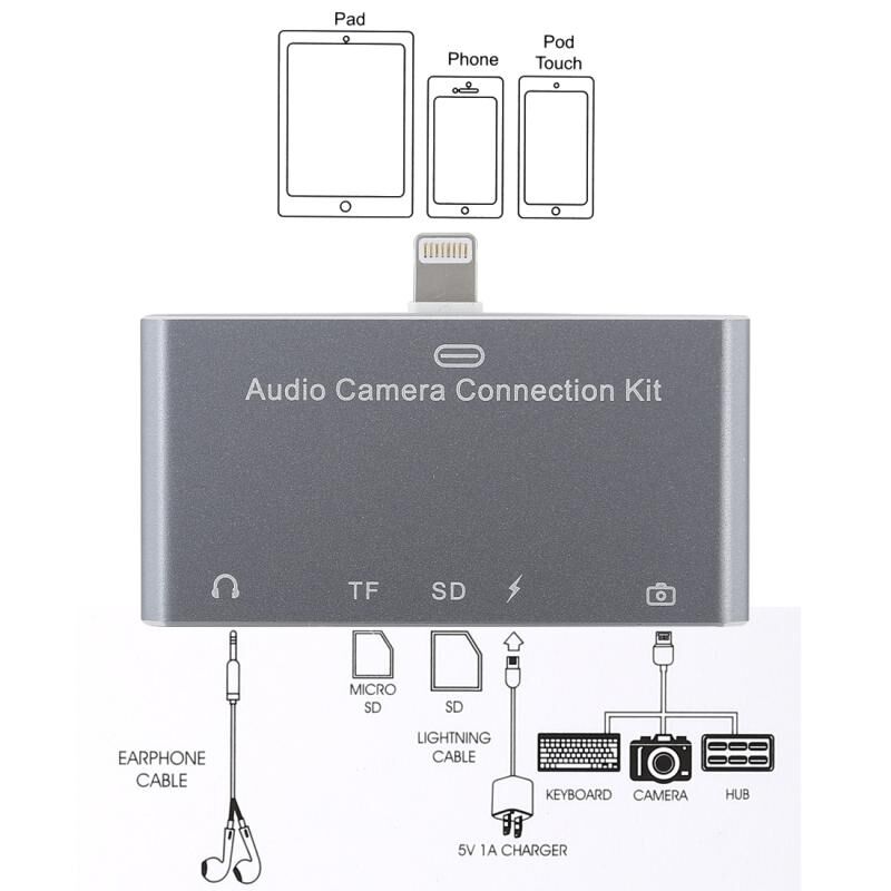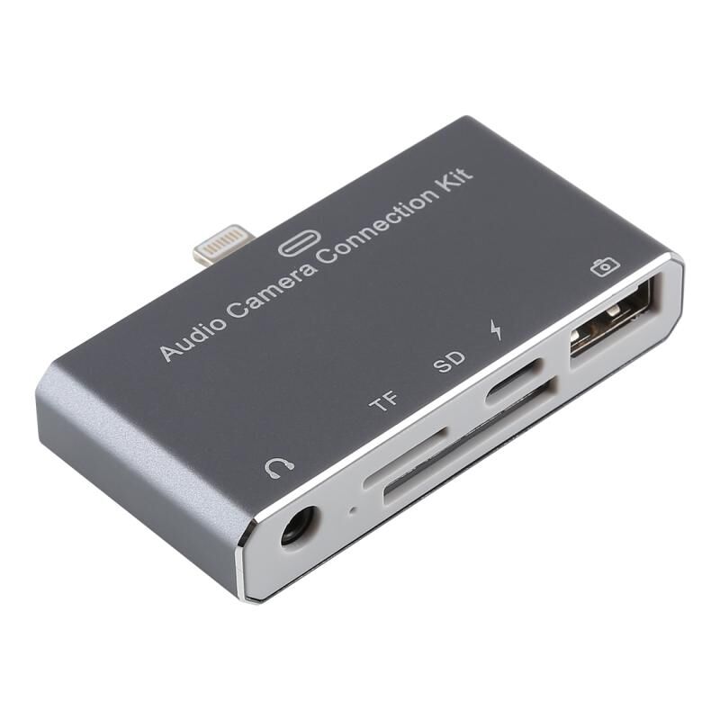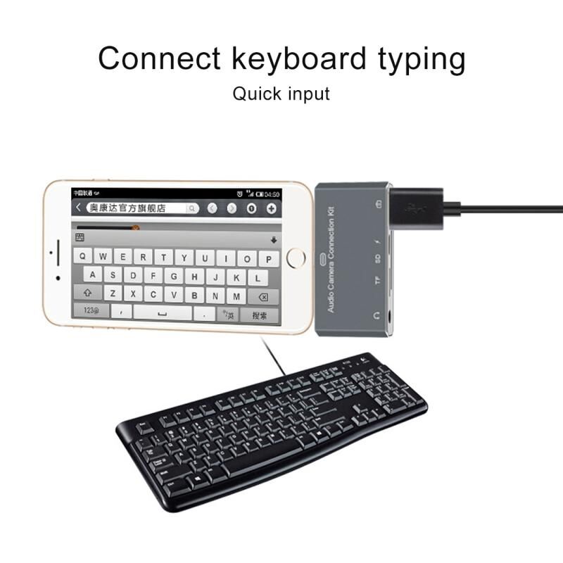 4. Important note: The 5 in 1 audio camera connection Kit has 5 ports. Except USB port. SD port, micro SD port can not use at the same time. The other port can use at the same time, you can listen the music and put keyboard type at the same time. If USB flash Disk/Micro SD card/SD card directly use with this kit. You must create "DCIM" folder.