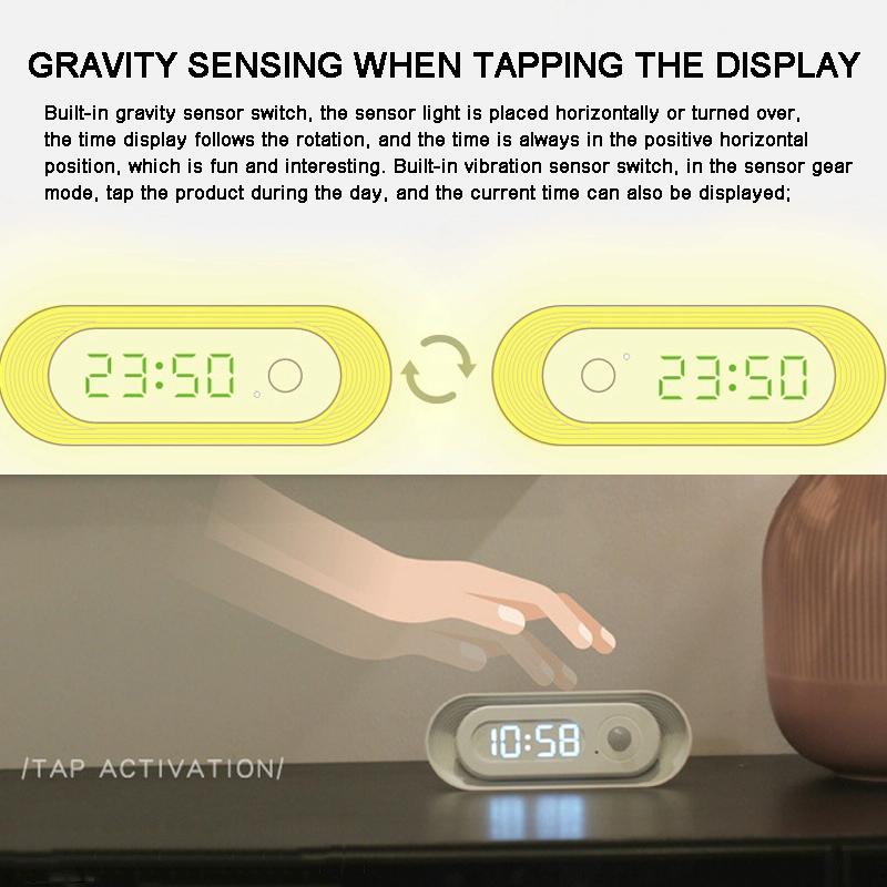 3. Ενσωματωμένος διακόπτης αισθητήρα βαρύτητας, το φως του αισθητήρα τοποθετείται οριζόντια ή αναποδογυρίζεται, η εμφάνιση της ώρας περιστρέφεται ανάλογα και η ώρα είναι πάντα σε θετική οριζόντια θέση, κάτι που είναι διασκεδαστικό και ενδιαφέρον. Ενσωματωμένος διακόπτης αισθητήρα κραδασμών, σε λειτουργία αισθητήρα, αγγίξτε το προϊόν κατά τη διάρκεια της ημέρας και η τρέχουσα ώρα μπορεί επίσης να εμφανιστεί.