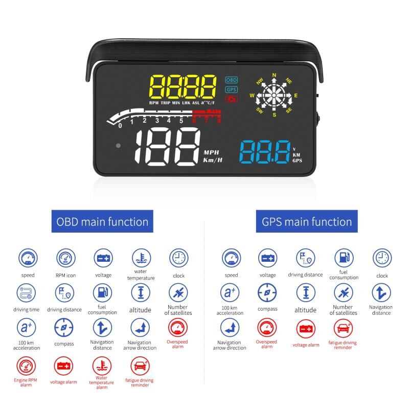 2. Λειτουργία OBD Εμφάνιση πληροφοριών: ένδειξη: ταχύτητα οχήματος, ταχύτητα περιστροφής, κατανάλωση καυσίμου (στιγμιαία κατανάλωση καυσίμου, στιγμιαία κατανάλωση καυσίμου ανά 100 χιλιόμετρα, μέση κατανάλωση καυσίμου), θερμοκρασία νερού, τάση, ρολόι, απόσταση οδήγησης, κατεύθυνση οδήγησης, υψόμετρο, αριθμός δορυφόρων, εικονίδιο ταχύτητας, δοκιμή επιτάχυνσης 100 χιλιομέτρων